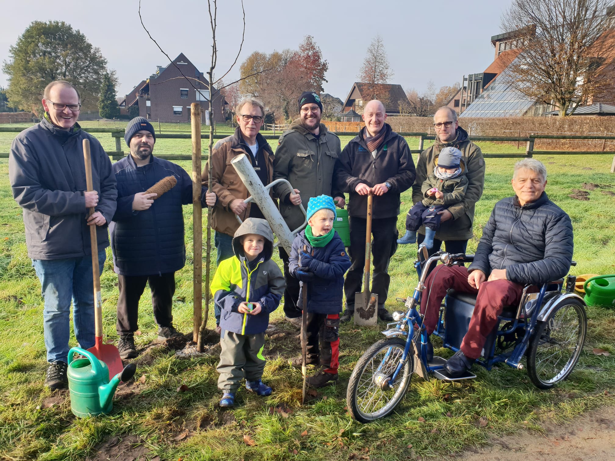 So geht es Baum um Baum, bis alle 15 eingebracht sind und man der Sassenberger Straße nahe ist. Mit Kokosband werden die jungen Bäume noch mit dem Baumpfahl verbunden, damit Winterstürme ihnen nichts anhaben können. In guten 2 Stunden war das (Sams)Tag(s)werk vollbracht!