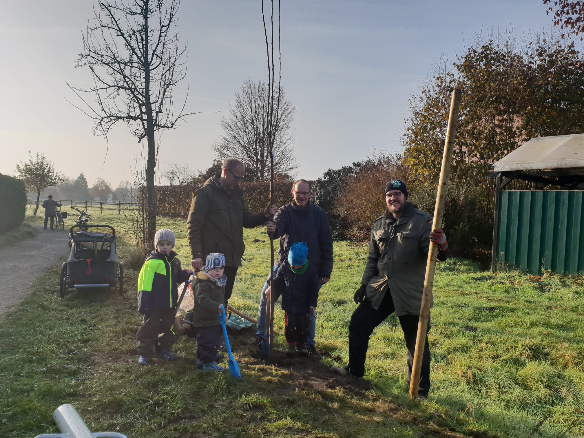 Am vergangenen Samstag ab 10 Uhr startete die Schwattjacken-Aktion dann so richtig. Die 5 Schwattjacken Thomas, Frank, Michael, Patrick und Oliver, zusätzlich verstärkt durch den Schwattjacken-Nachwuchs (Jonathan, Mats und Luuk) sowie Georg und Jürgen holten das Pflanzmaterial aus Jürgens Garten in der Nachbarschaft. Die Apfel-, Birn- und Kirschbäume sowie einige Pflaumenbäume wurden, sich abwechselnd, auf der Wegstrecke verteilt.